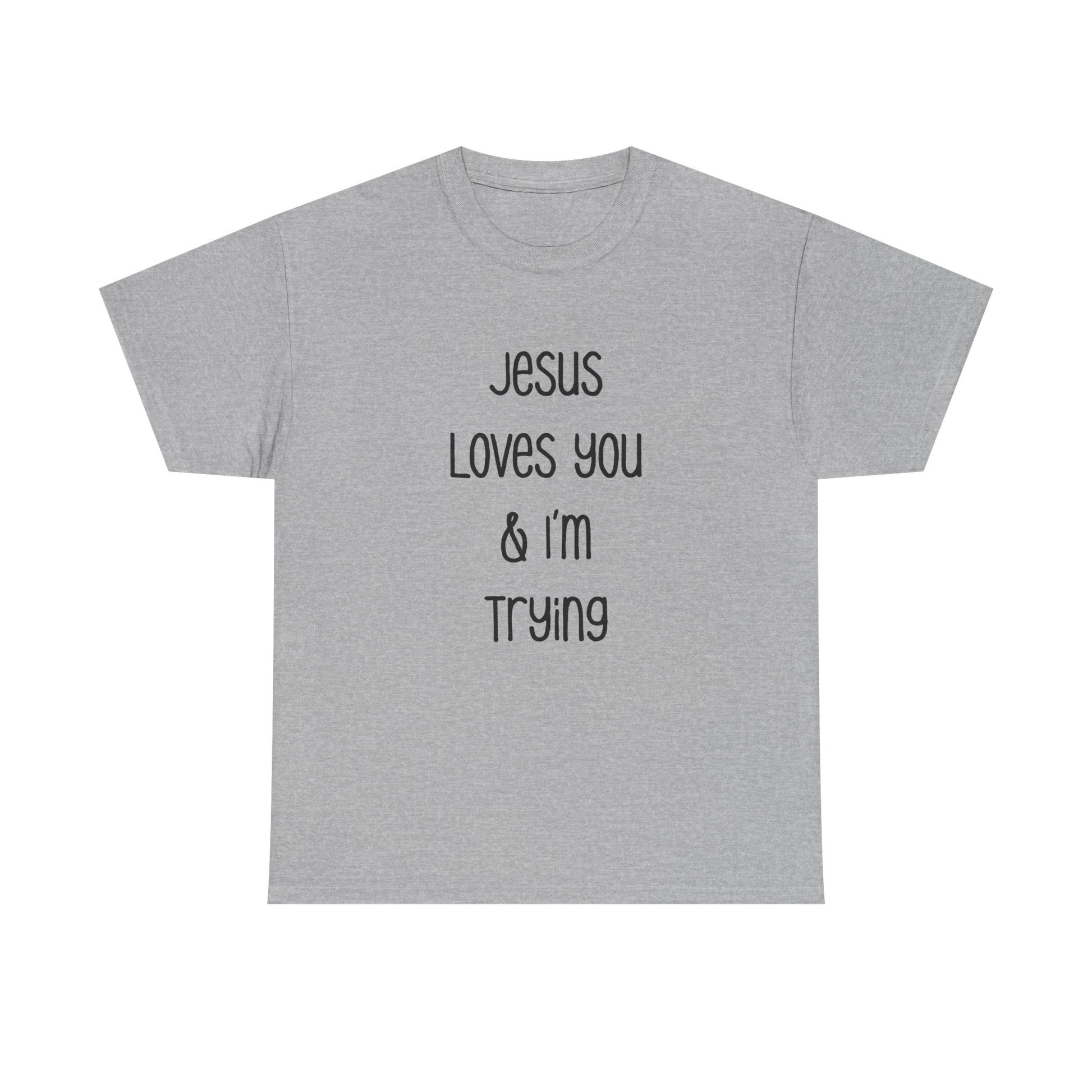 Embrace comfort and a message of encouragement with this Unisex Heavy Cotton Tee. Designed for everyday wear, it offers a relaxed fit that makes it perfect for casual outings or cozy nights in. The T-shirt radiates positivity with the uplifting slogan, "Jesus Loves You & I'm Trying," making it an ideal choice for those who appreciate faith and motivation in their daily lives.